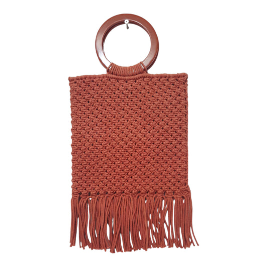 Rust Handmade Crochet Tote Bag with Wooden Ring Handles and Fringe – Boho Chic Macramé Purse